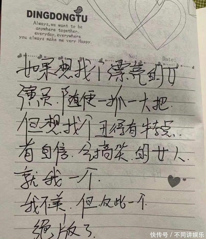 但最让东说念主印象深入的却是她在高中日志本上写下的那句:要是思找个漂亮的女演员,粗率一合手一大把,但思找个丑得有特色、有自信、会搞笑的女东说念主,就我一个。我不好意思,但仅此一个。